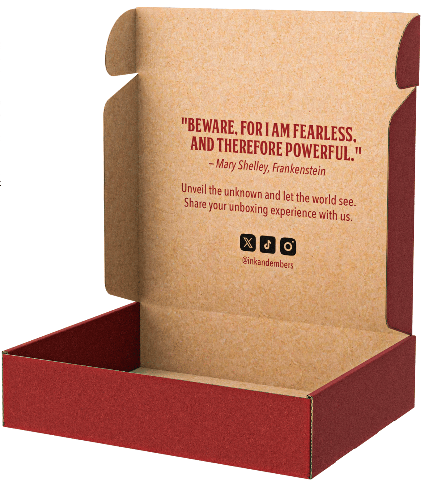 Below the quote, a simple message invites the reader to “let the world see” by sharing their unboxing experience on social media, with easy-to-find icons for tagging the brand. This small detail creates a personal connection and encourages them to show off the items inside.