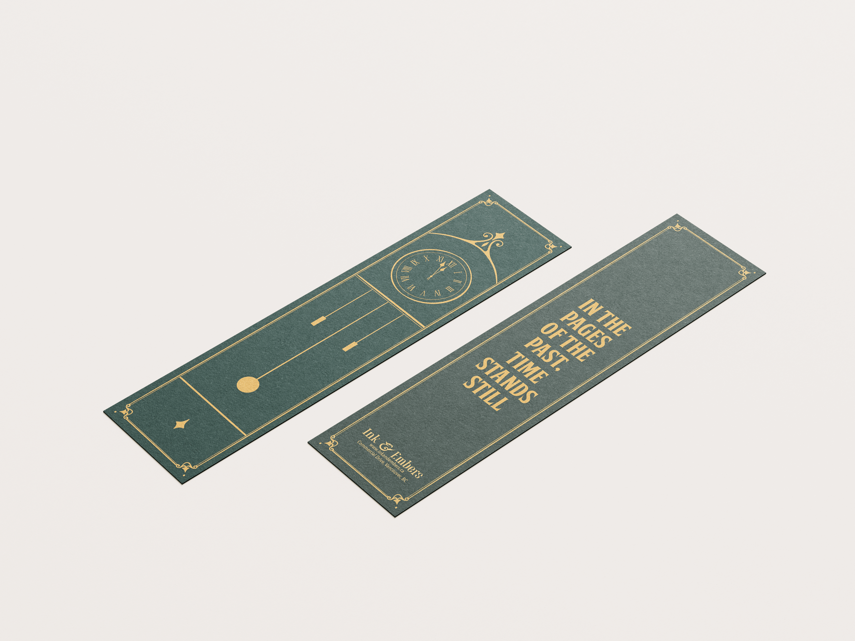 Roman numerals for twelve and six are included to symbolize time passing, with a nod to midnight as the perfect moment to dive into a book. Decorative borders and detailed designs give the boxes an old-fashioned feel.