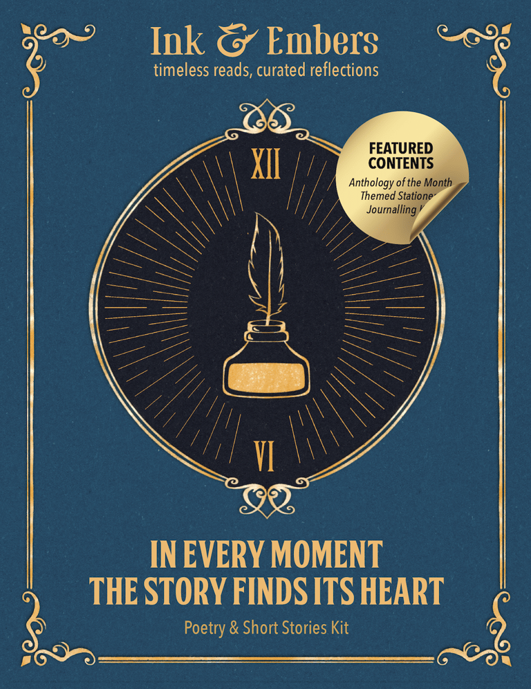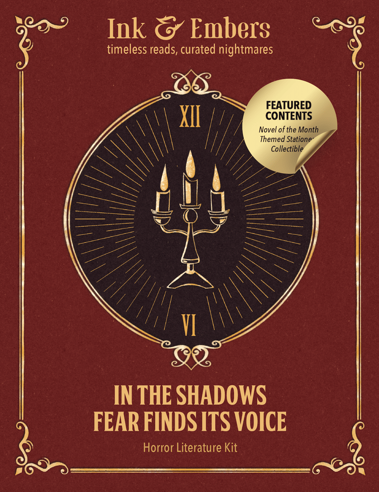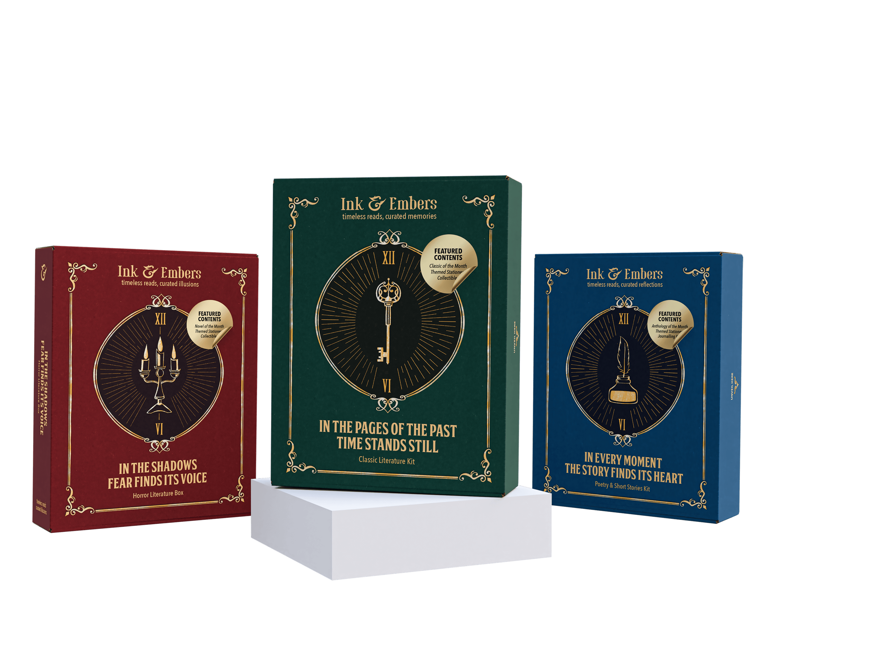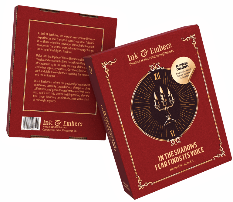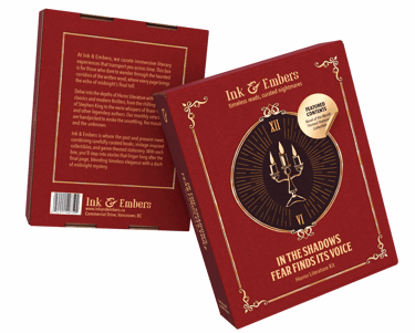 The Ink & Embers boxes have a classic, vintage-inspired design. Each genre has a unique symbol on the front that represents its theme like a key for classic literature, a candelabra for horror, and a quill for poetry and short stories.