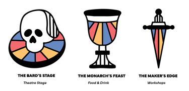 The Bard’s Stage represents the theatre stage, drawing on iconic imagery like the skull to reflect drama and storytelling. The Monarch’s Feast symbolizes food and drink, evoking the festive spirit of banquets and celebrations seen in Shakespeare’s plays. The Maker’s Edge illustrates workshops, combining the sharp creativity of crafting with the precision of tools from Shakespeare’s world.